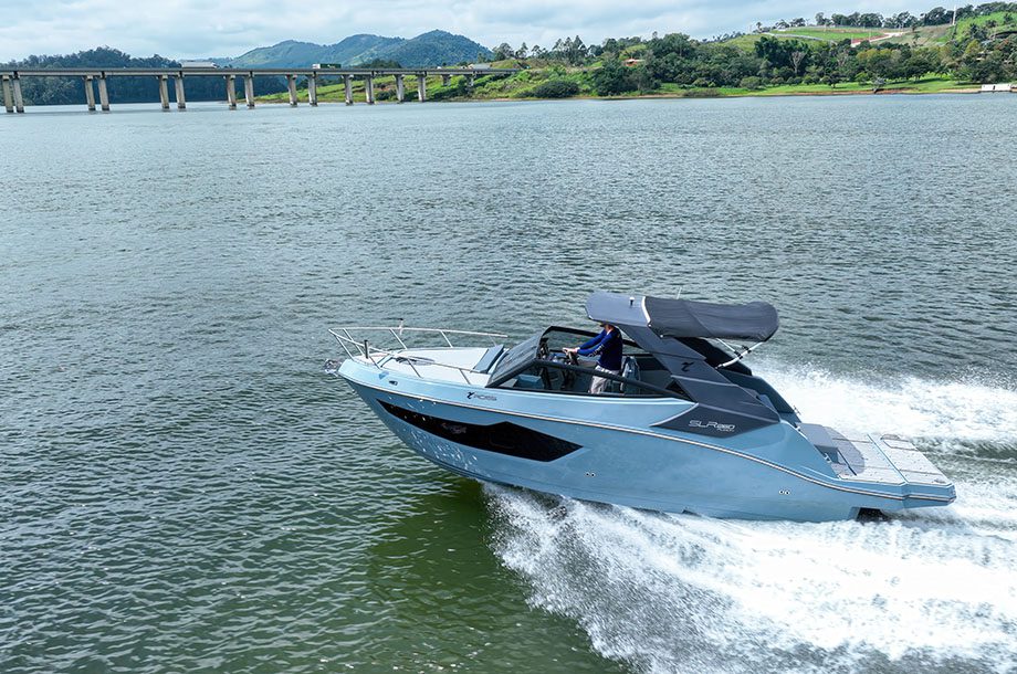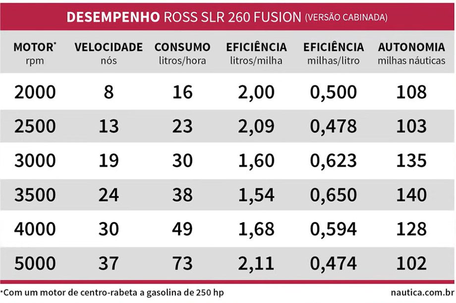 Um dos grandes atrativos da lancha — que faz parte de uma linha chamada Sport Luxo Ross, daí a sigla SLR — é permitir tanto motor de popa quanto de centro-rabeta, gasolina ou diesel.