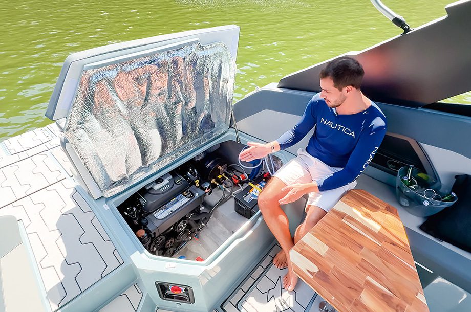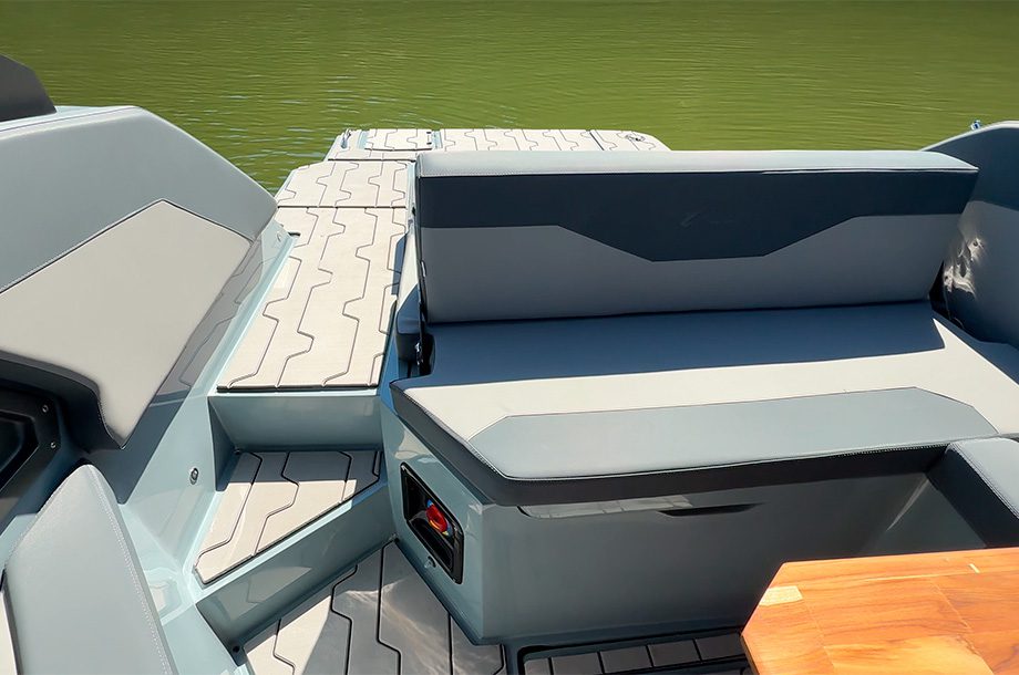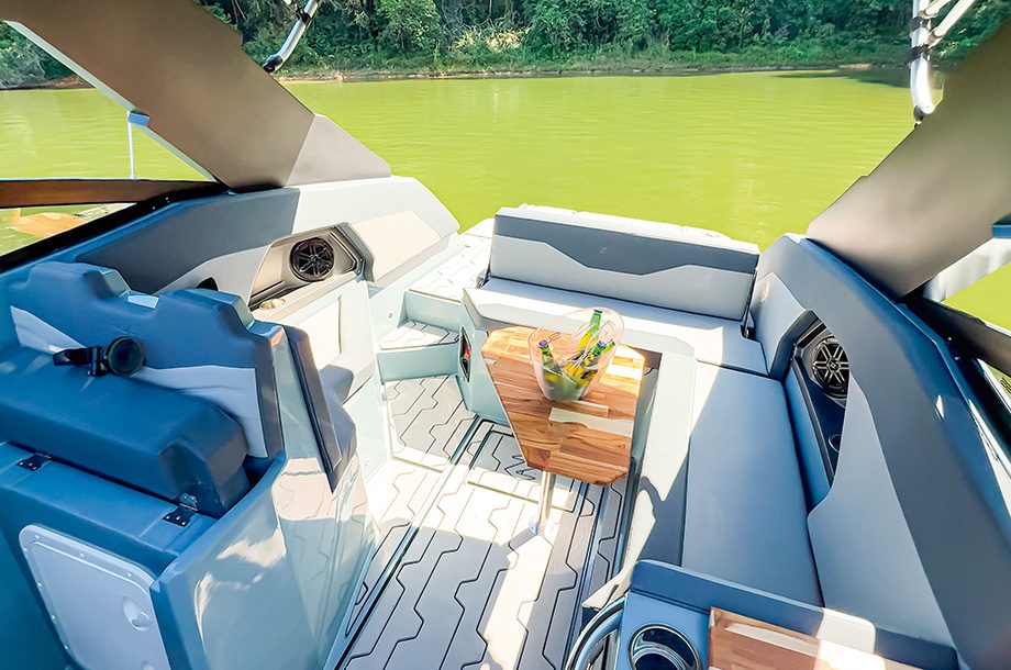 O de centro-rabeta, como o da unidade deste teste, não rouba espaço na plataforma de popa e ainda tem a vantagem de abrigar um sofá conversível em solário em cima da caixa do motor. Já o motor de popa é a opção mais econômica e não ocupa espaço dentro do barco.