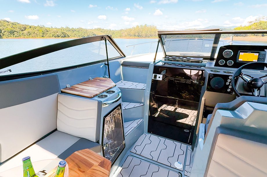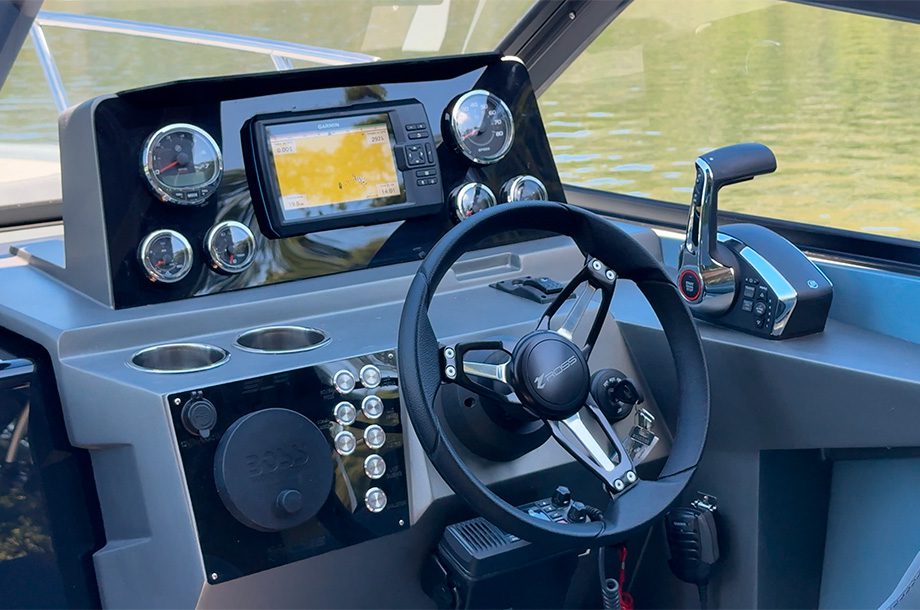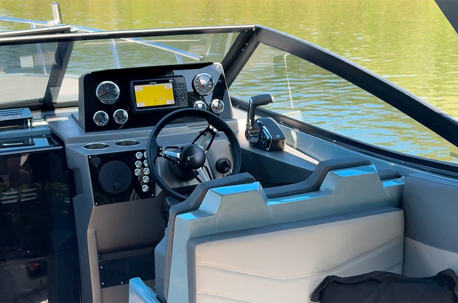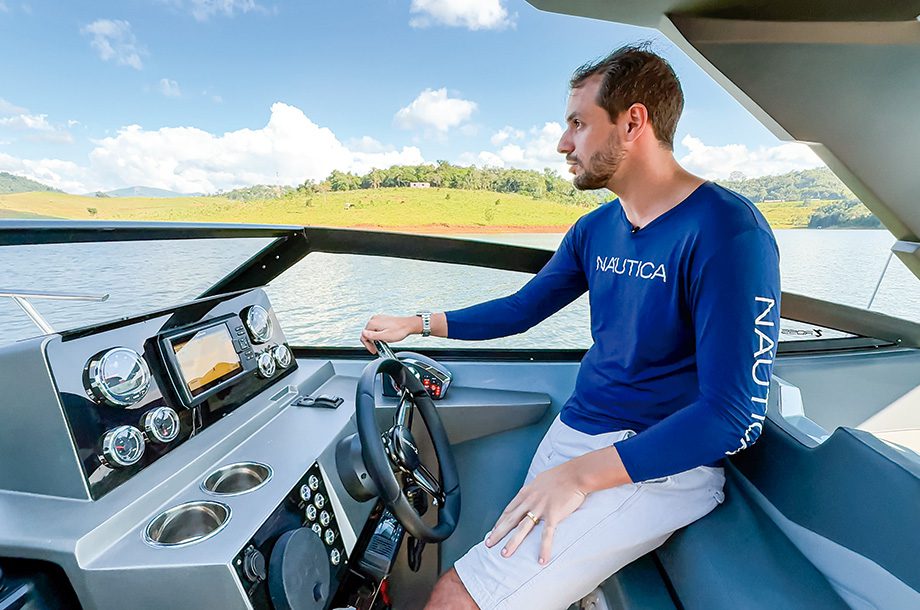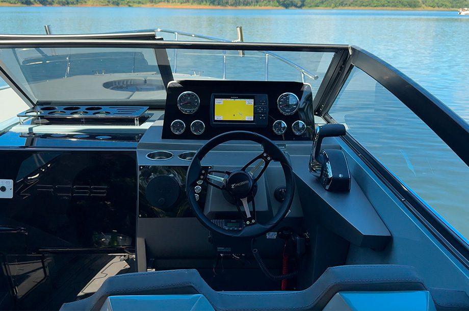 A unidade testada estava equipada com um eletrônico multifunções da Garmin, com sonar, cartas náuticas e dados do motor, entre outros itens. Uma aba na parte superior do painel protege a visão do piloto contra os reflexos da luz solar.