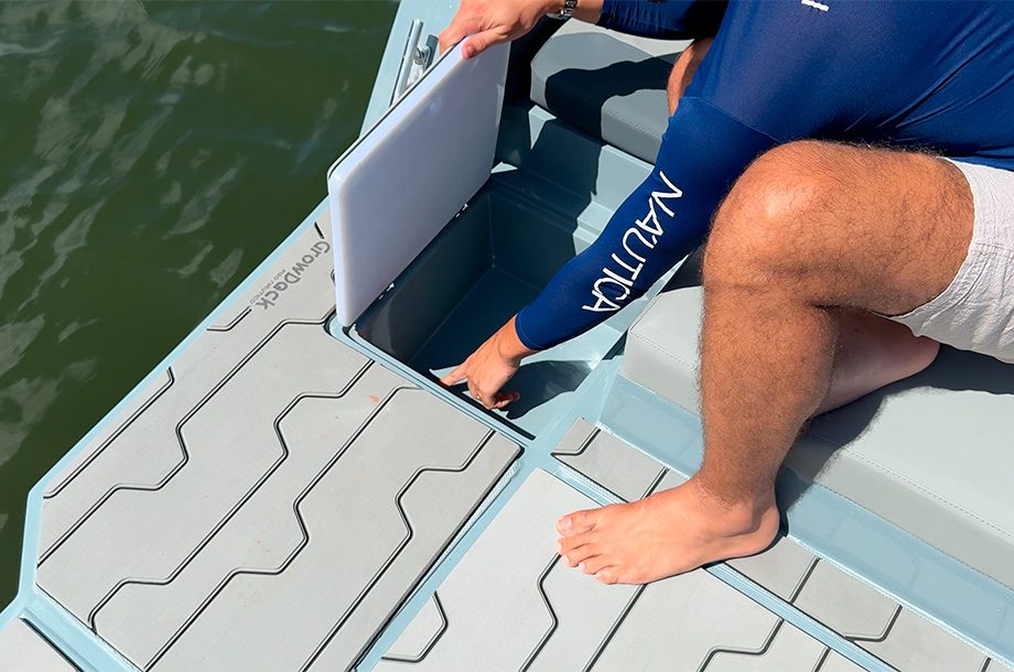 Ainda na plataforma de popa, há um suporte a bombordo para a colocação de uma churrasqueira náutica móvel, de inox, com sistema de encaixe, além de um olhal a boreste para puxar um brinquedo náutico, como boia, esqui e wakeboard, por exemplo. A escada para quem volta da água, fixada a boreste, tem quatro degraus e um pega-mão, como deve ser.