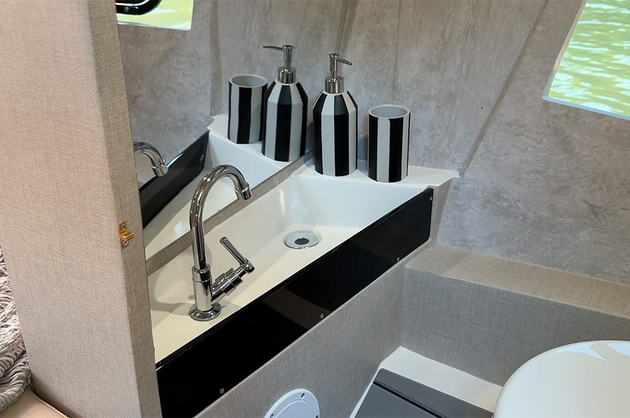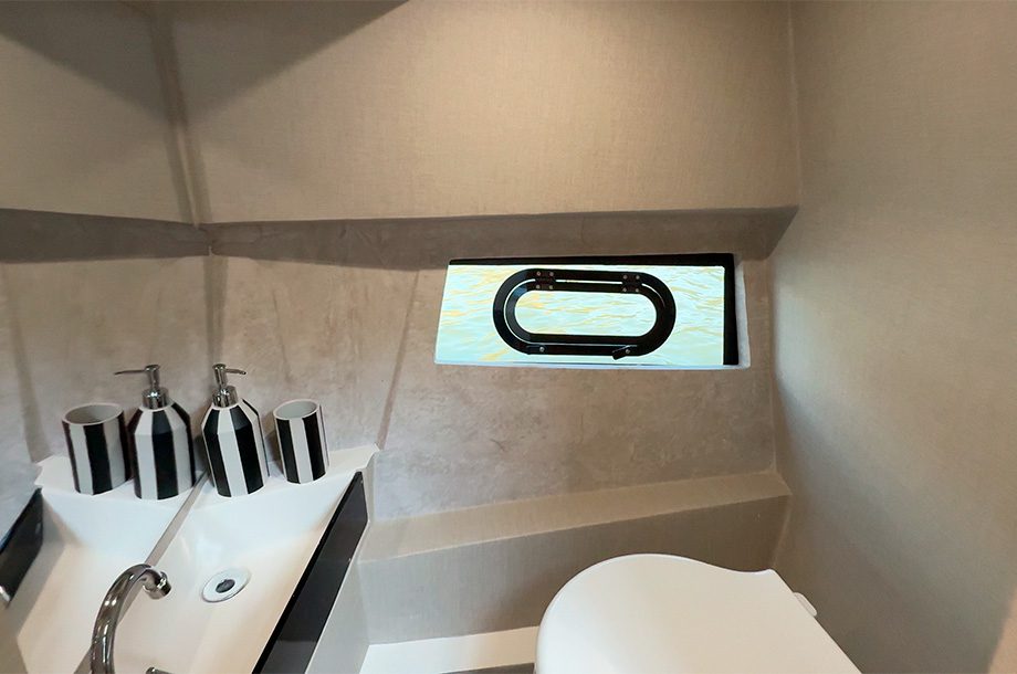 O banheiro, fechado com uma porta de acrílico com duas folhas, vem equipado com pia, torneira, espelho, ducha, vaso sanitário elétrico (de série) e vigia de ventilação. O ambiente é 100% revestido com um adesivo de linho italiano. Com isso, não se vê a fibra de vidro aparente, o que torna a cabine ainda mais confortável.