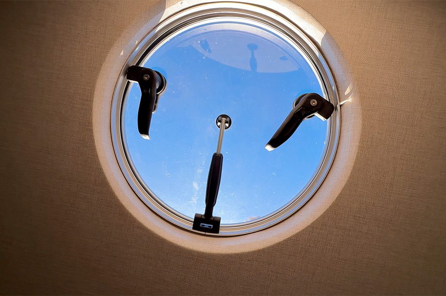 Para a iluminação e ventilação natural, há uma gaiuta sobre a cabeceira da cama e duas janelas laterais (uma com vigia com entrada de ar), que ficam na linha d’água para que, mesmo na cabine, não se perca o contato com água.