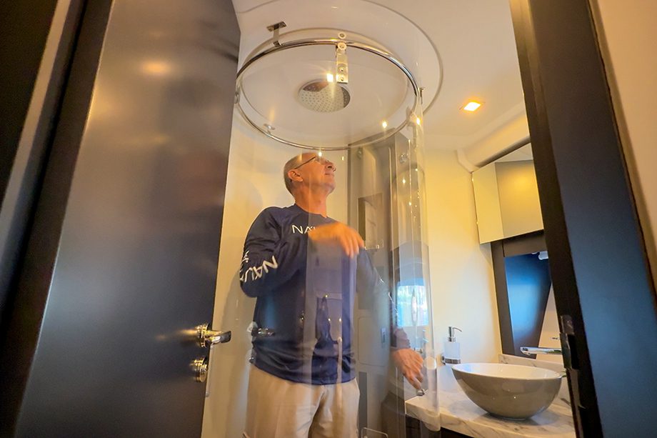 Há armários com prateleiras nos dois bordos e luzes de cabeceira. Como costuma acontecer nas embarcações da Schaefer, o ambiente (além de contar com ar climatizado) é iluminado e ventilado naturalmente, por meio de uma escotilha no teto e as duas vigias fixadas nas janelas laterais. No banheiro, com boxe fechado de 0,77 metro na menor dimensão e 1,98 metro de altura, ninguém bate a cabeça (nem os cotovelos) na hora do banho.