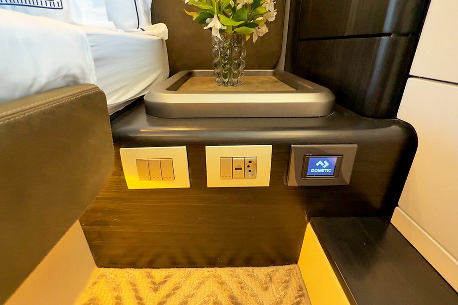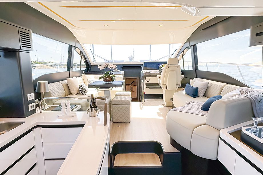 Depois da cozinha, vem a sala de estar, composta por dois grandes sofás, um em cada bordo. O maior, a bombordo, conta com uma mesa de centro com controle elétrico de altura e abas dobráveis — solução prática que ajuda a liberar espaço quando a mesa não está em uso; aberta, pode acomodar até seis pessoas. Por conta do controle de altura, é possível baixá-la até o mesmo nível do sofá e formar uma cama de casal provisória no salão.