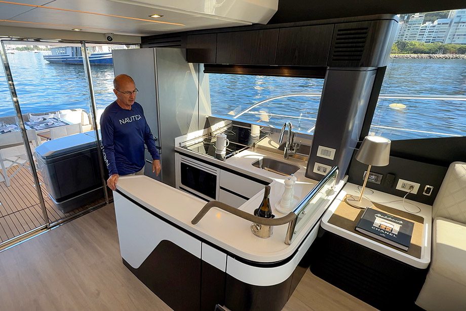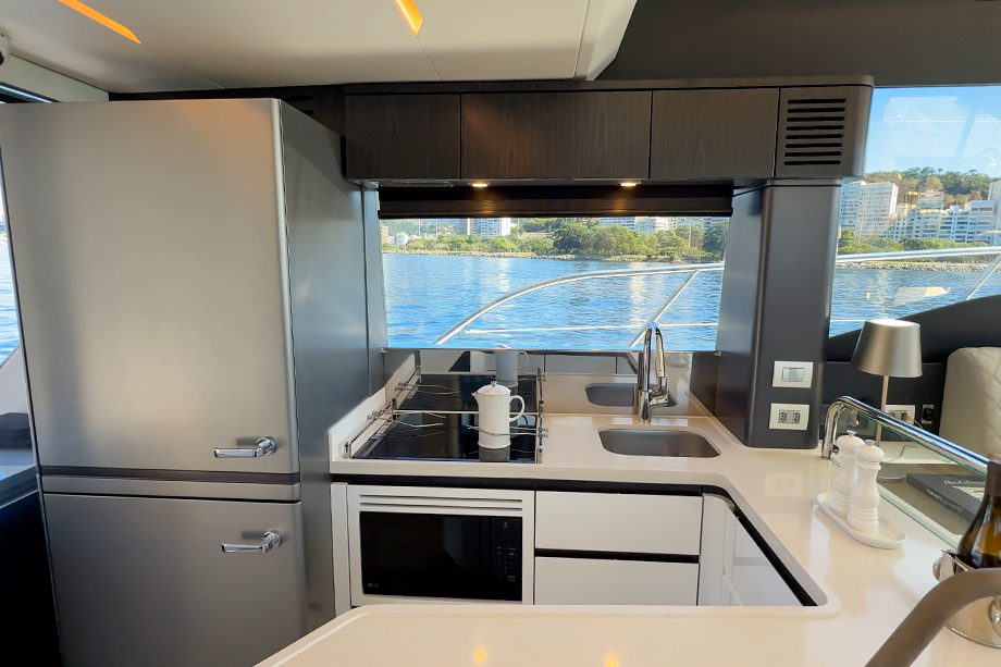 Logo na entrada do salão, a bombordo, a cozinha em formato de “U” está em uma posição prática para o porte desta lancha, já que ocupa pouco espaço e mantém o chef próximo da praça de popa, favorecendo a integração entre as pessoas. Completa, tem geladeira-congelador vertical padrão residencial, micro-ondas e fogão por indução de quatro bocas com suporte para travar as panelas durante o balanço do barco.
