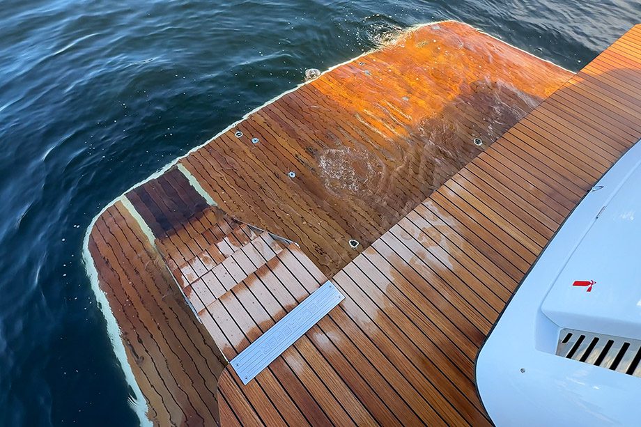 Já a plataforma de popa tem 1,99 metro de comprimento, sendo cerca de 1,30 metro de área submersível — uma escada do tipo robô, de cinco degraus, monta-se automaticamente quando a plataforma desce.
