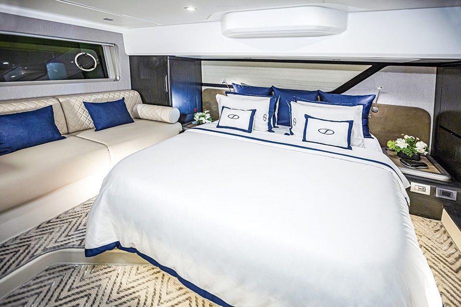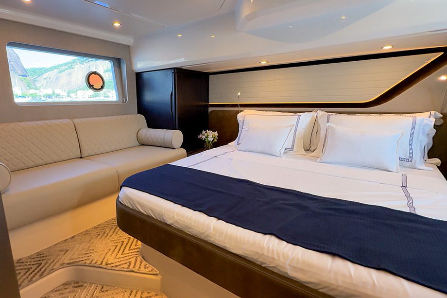 Como é padrão nas lanchas modernas deste porte, a suíte principal fica posicionada a meia-nau — localização estratégica, que permite aproveitar toda a largura da embarcação, próxima dos cinco metros, oferecendo o máximo de conforto.