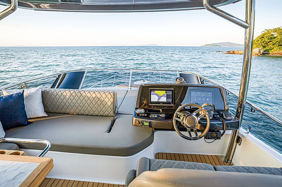 O posto de comando, a boreste, conta com um banco duplo — para o condutor e um acompanhante — e um painel com espaço adequado para os instrumentos de navegação e dos motores. À frente, um defletor ajuda a desviar parte do vento, beneficiando todos no flybridge, especialmente quem estiver no solário, que se estende à frente e ao lado da estação do piloto.