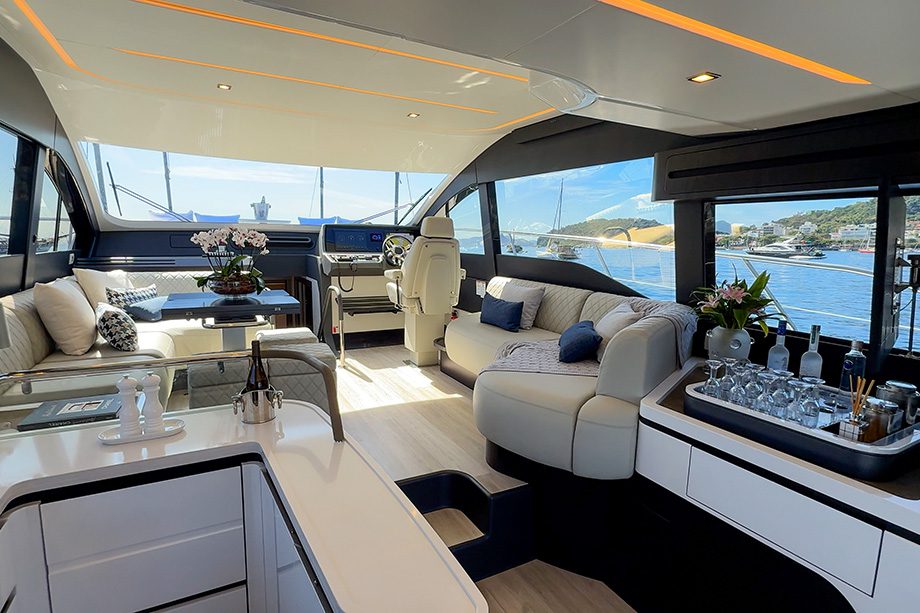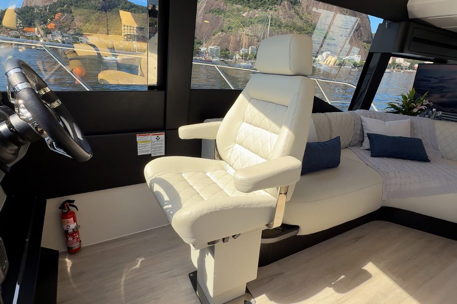 No outro bordo, fica o posto de comando interno. O piloto conta com uma poltrona de couro natural, com regulagem de distância e inclinação do encosto. Embora houvesse espaço para uma poltrona dupla, o estaleiro optou por uma versão individual, o que contribui para uma área de circulação mais ampla e facilita a movimentação do condutor.