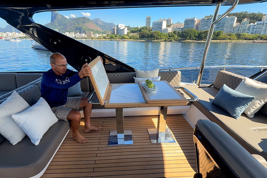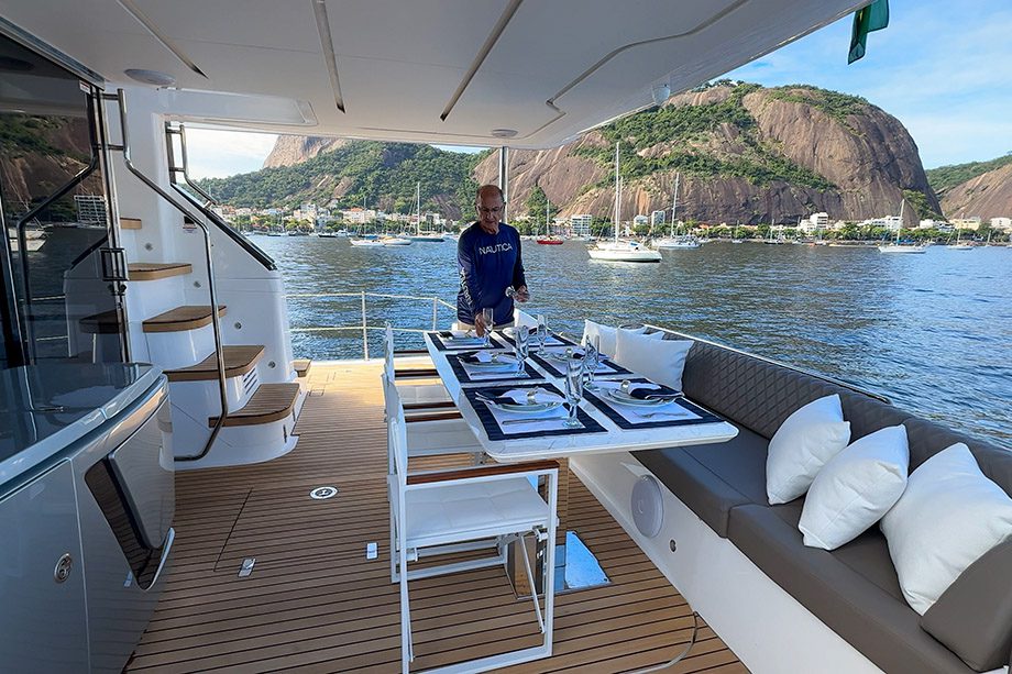 No centro do flybridge, a bombordo, fica a terceira mesa de jantar (ou de conveniência), também com folhas dobráveis, para até seis pessoas, usando banquetas como assentos. Na parte de ré, há um terceiro ambiente, com sofá em “L” a bombordo para quatro pessoas, sem apertos, e outra mesa de centro, além do indispensável espaço gourmet, do jeito que os brasileiros gostam.