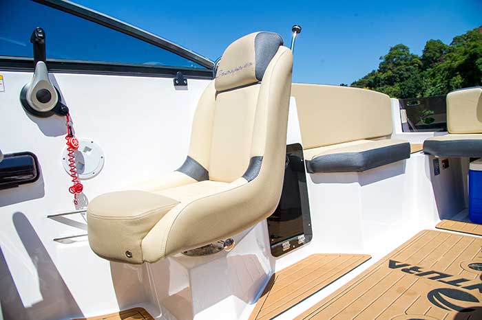 O posto de comando tem um banco giratório, tornando a área de convivência ainda maior quando o barco estiver parado. Durante a navegação, há um bom suporte para os pés do piloto e uma trava mantém o banco fixo. Se o dono do barco preferir, o painel pode ter apenas uma tela multifunção, de 7 polegadas, com gps e sonda, sem os reloginhos convencionais do motor, mas sim com instrumentos digitais — o que dá um ar de modernidade ainda maior a esta lancha.