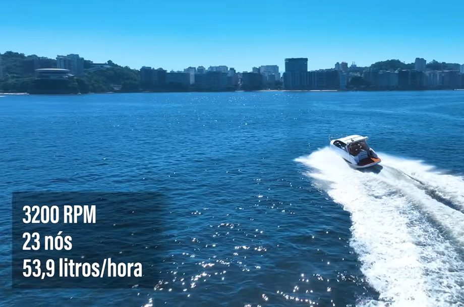 Na aceleração, o tempo médio para ir da marcha lenta aos 20 nós ficou abaixo dos 13 segundos — resultado notável para uma lancha de 36 pés com apenas um propulsor. É um motor com pulmão! A estabilidade do casco e o centro de gravidade bem distribuído garantiram uma navegação firme, com pouca elevação de proa, mesmo em aceleração plena.