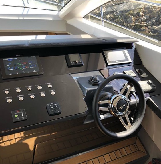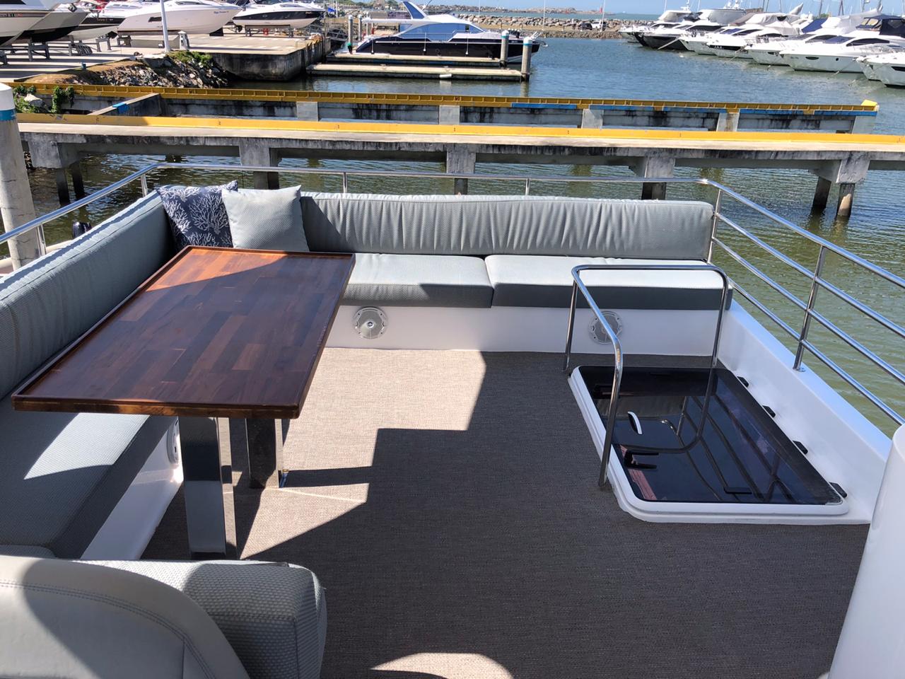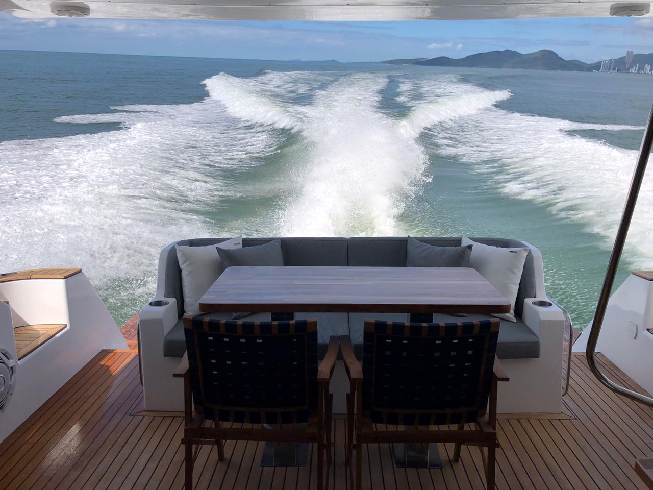 Com duplo comando, a Tethys 54 Fly pode ser conduzida também do flybridge, que por sua vez é amplo e vem com estrutura rígida para o teto central retrátil. A 54 já sai de fábrica com uma vantajosa plataforma de popa submergível, que se torna um de seus espaços preferidos. A motorização fica por conta de uma parelha de D8 – IPS 800 da Volvo Penta.