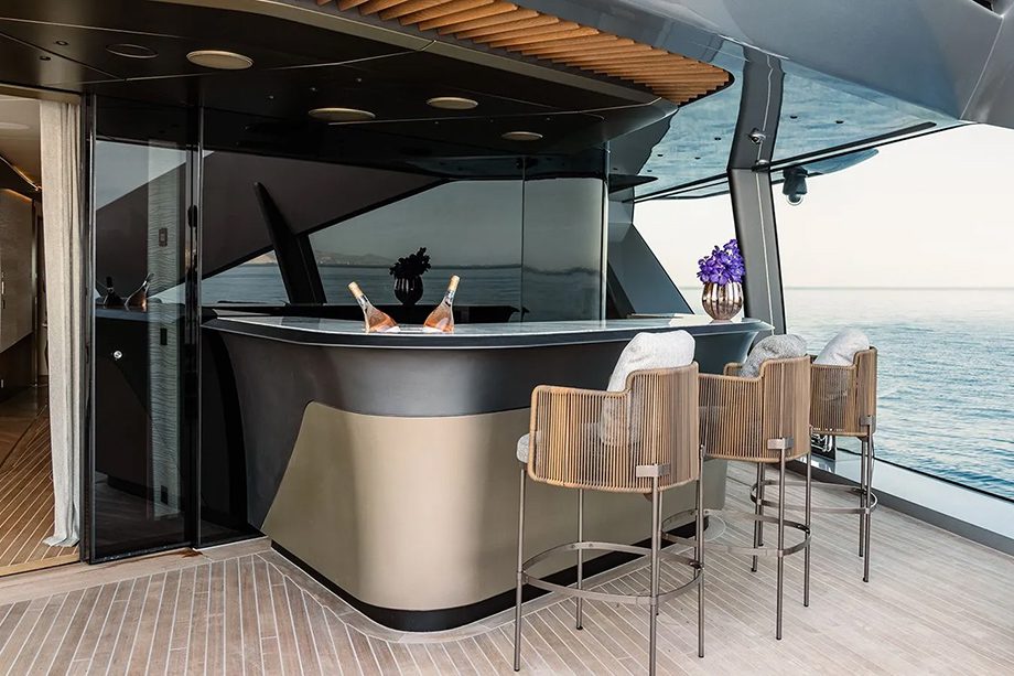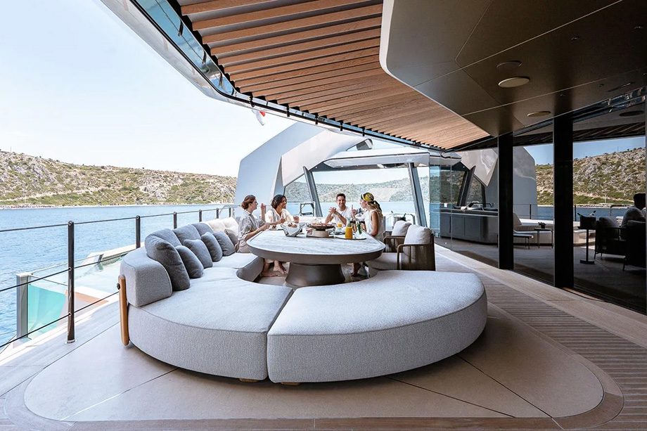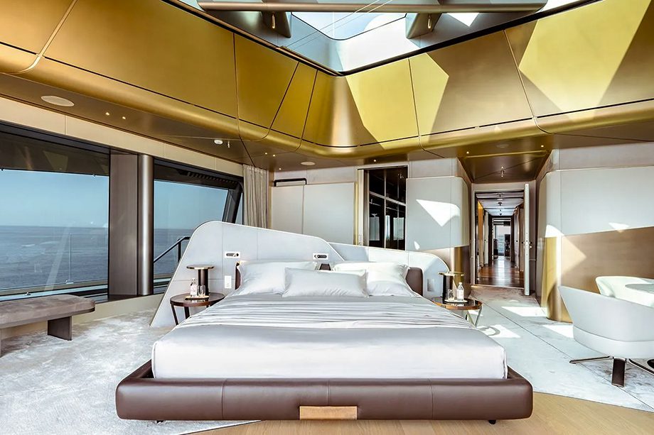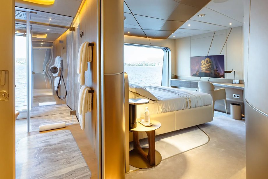 São cinco suítes para convidados e uma suíte master que mais parece uma residência privativa em dois níveis, com terraço panorâmico, closet e pé-direito de 3,3 metros. A privacidade garantida no maior cômodo, por sua vez, é comum em todos os ambientes — o que, segundo a IYC, faz parte do conceito da embarcação.