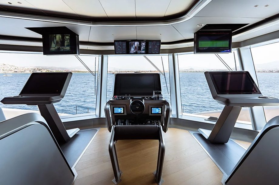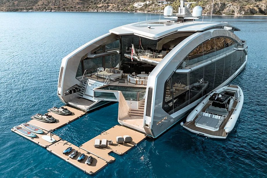 Apesar da imponência, a homologação é para 12 hóspedes, atendidos por uma tripulação de 16 pessoas. As laterais, quase totalmente envidraçadas, somam mais de 600 m² de superfície em vidro, permitindo conexão constante com o exterior, independente de onde estiver a bordo.