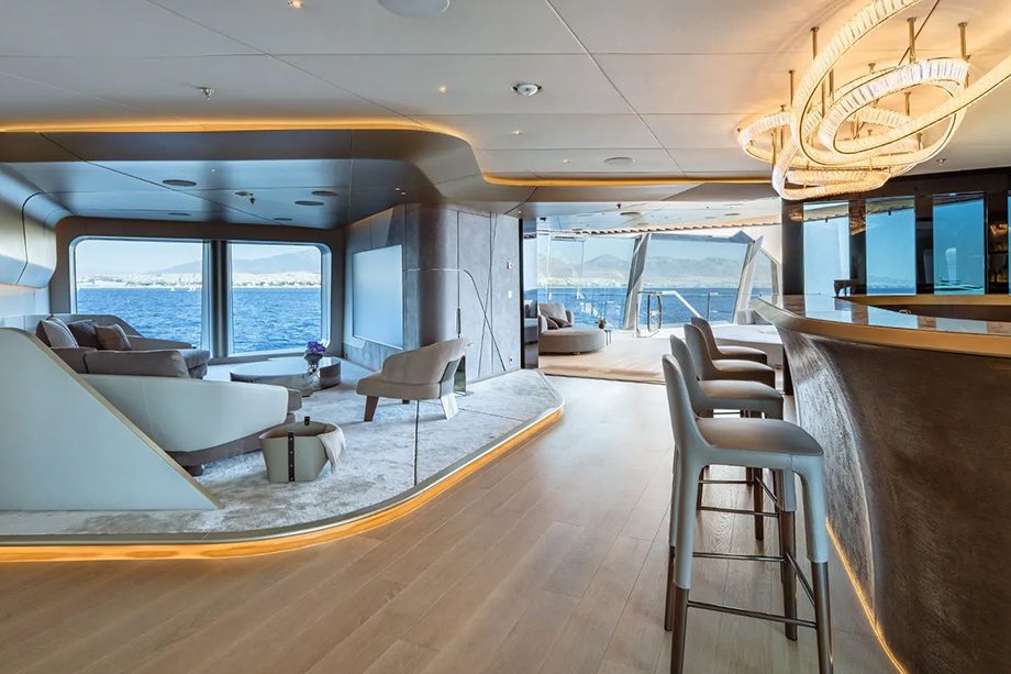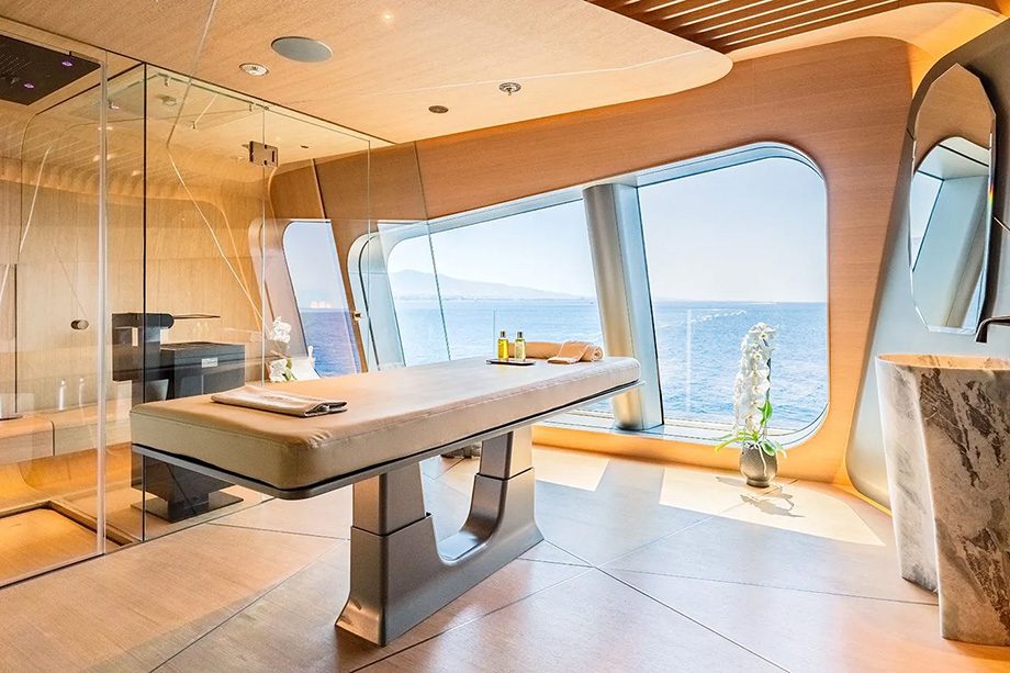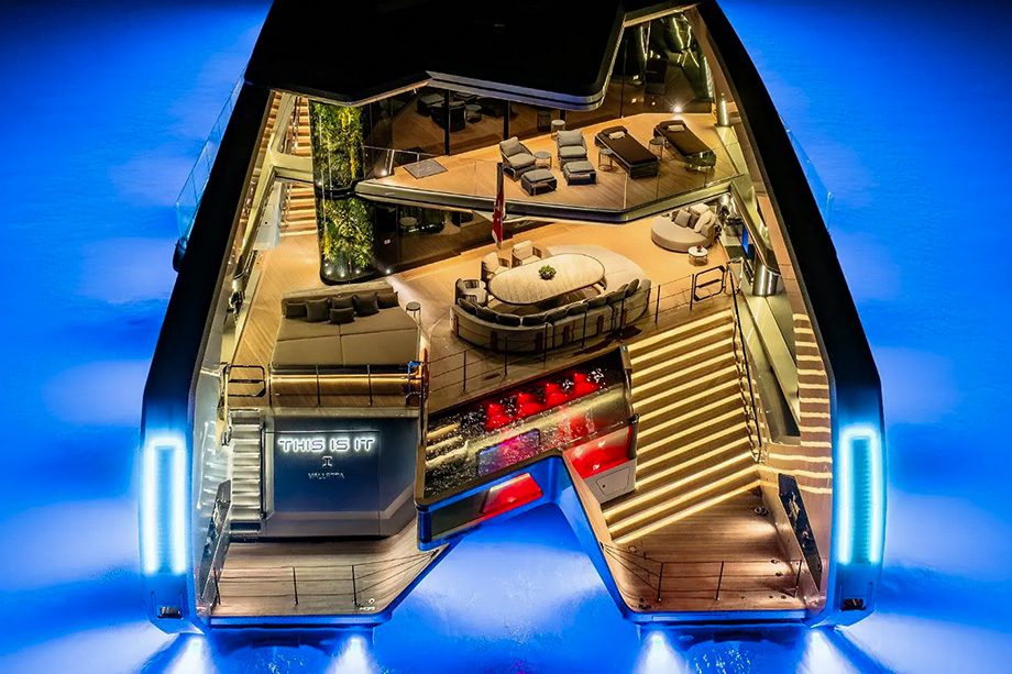 As áreas comuns reforçam essa proposta: spa, cinema, lounges, bares, academia e amplos espaços de convivência poderiam acomodar todos os convidados ao mesmo tempo sem sequer parecerem lotados. À noite, o projeto de luzes transforma o iate em um espetáculo à parte, com refletores e LEDs azuis que realçam a silhueta futurista.