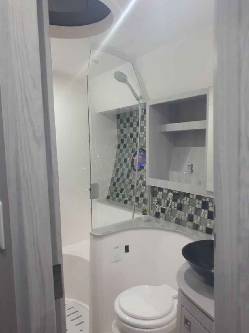 Mesa para refeições com sofá e geladeira são características da praça de popa. No pavimento inferior, possui dois camarotes e acomoda confortavelmente quatro pessoas para pernoite. Outro destaque do modelo é o pé-direito dos camarotes e dos banheiros que varia entre 1,9m a 2m de altura. Já a cozinha possui pé-direito duplo. A lancha pode ser equipada com dois motores D6 330 HP ou IPS 500 HP e custa a partir de R$ 1 600 000.