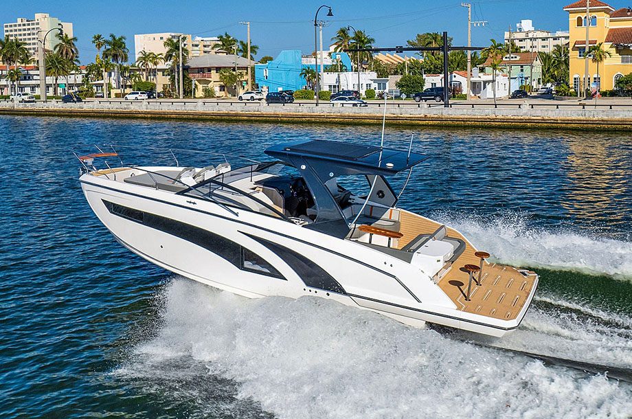A 38 Flyer T-Top também é outra que ostenta o recurso com acionamento elétrico. O barco ainda possui uma extensa plataforma de popa, um espaço gourmet e banco com encosto móvel — mais um ponto que melhora os espaços de convivência da linha.