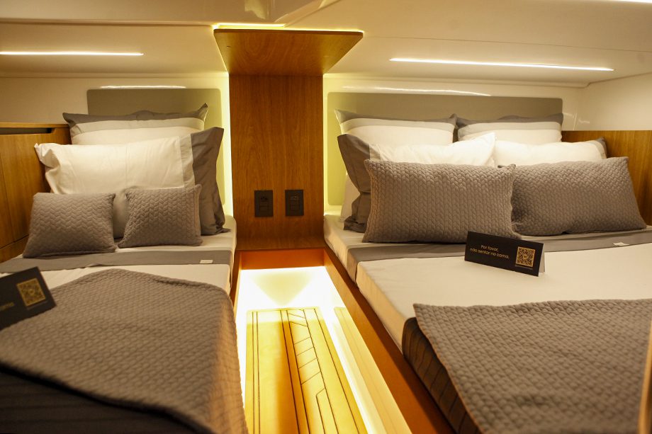 A V370 chama atenção pelos diferenciais dentro e fora da embarcação. Na área externa, a plataforma gourmet foi ampliada para receber mais convidados do que o comum em barcos de 37 pés. Já no interior, duas cabines fechadas com porta oferecem mais privacidade e conforto.