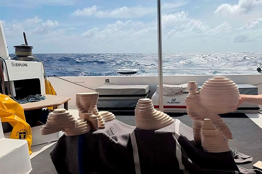 O fato de tudo estar sendo feito a bordo fez com que com a equipe se antecipasse e trouxesse quase meia tonelada de compensado de madeira para a embarcação. “Você não apenas produz uma exposição — que já é algo complicado em terra — mas também tem que imaginar as diferentes condições, o vento, o movimento do barco e a combinação”, revelou à NÁUTICA.