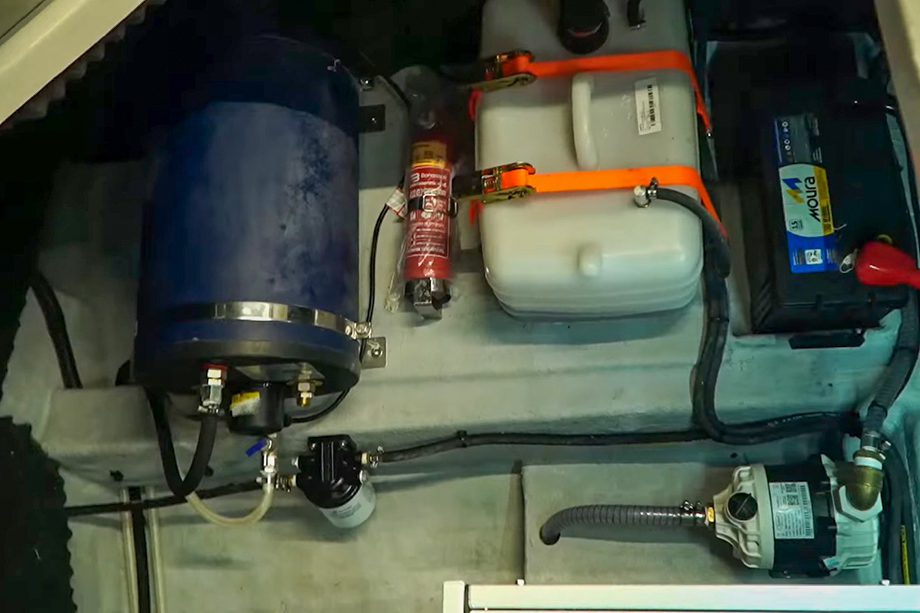 O barco vem equipado com gerador, boiler, ar-condicionado, parelha de popa, inversor e carregador de baterias, tudo identificado e dividido em caixas de acrílico para evitar qualquer tipo de contaminação com a água– explicou Hélio Campos, CEO da marca