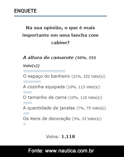 O resultado da pesquisa? Para a grande maioria dos internautas (50%), a altura do camarote é o que mais importa na escolha de uma lancha deste porte. Ter um camarote com bom pé-direito recebeu 555 votos.